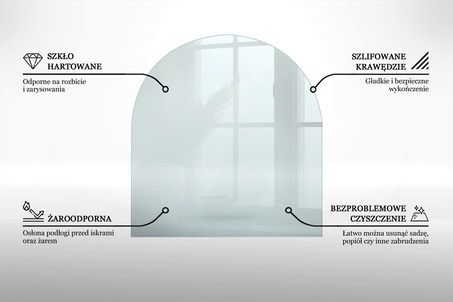 Szyba pod kozę półokrągła transparentna to Twoja dekoracja, która świetnie sprawdzi się jako stylowy dodatek do salonu lub pokoju dziennego. Wprwoadzi tam poczucie porządku i elegancji. Uniwersalny wygląd doskonale współgra z drewnem, kamieniem oraz innymi materiałami. Podkreśli przy tym wyrafinowany styl całego wnętrza. Dzięki solidnej konstrukcji z hartowanego szkła zapewnia trwałość i stabilność. Czyni ją to idealnym rozwiązaniem pod każdy kominek. Wzbogaca przestrzeń, przyciąga spojrzenia i sprawia, że wnętrze staje się bardziej przytulne oraz luksusowe.